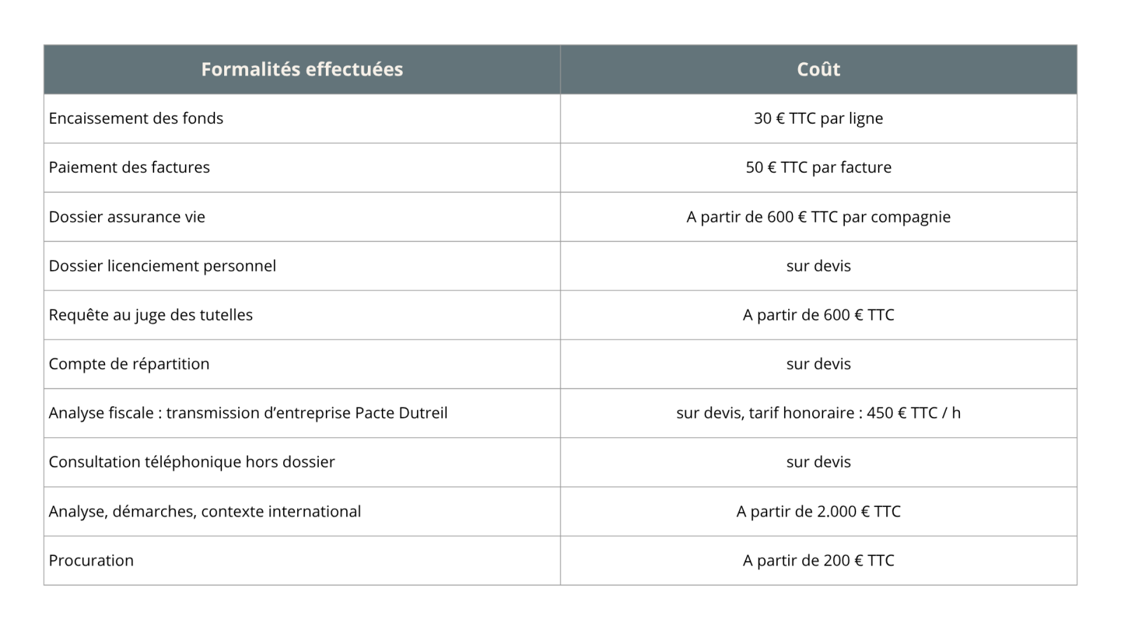 être confiées à l'office notarial et seront facturées de la manière suivante :
